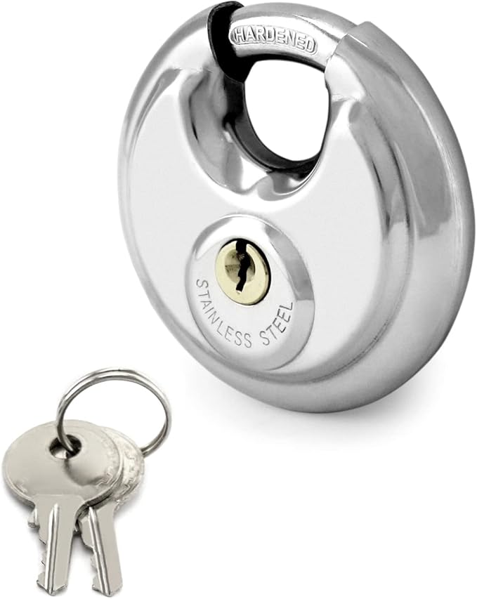 Protect gates, sheds & storefronts with the Noble 70 mm stainless-steel disc padlock. Weatherproof, rustproof & cut-resistant, it ships with 2 keys and a 1-month warranty.